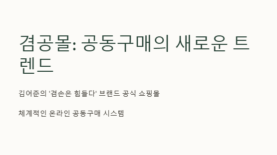 겸공몰(겸손은 힘들다 몰)은 김어준 브랜드의 공식 쇼핑몰이자, 공동구매의 편리함과 플랫폼의 신뢰성을 결합한 혁신적인 쇼핑 방식입니다. 합리적인 가격과 다양한 상품을 손쉽게 구매할 수 있어 소비자들에게 인기가 높아지고 있으며, 향후 더 많은 쇼핑몰과 브랜드들이 겸공몰 형태로 확장할 가능성이 큽니다.