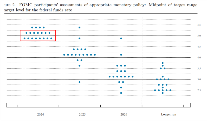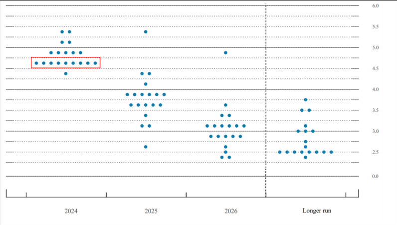 이번 6월 FOMC 회의에서 기준금리는 동결되었습니다. 하지만 점도표에 따르면, 연준 위원들은 올해 한 번의 금리 인하와 내년에는 네 번의 금리 인하를 예상하고 있습니다.