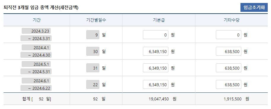 - 최종 3개월 임금: 퇴사일 기준으로 역산하여 3개월분의 임금을 계산해야 합니다.