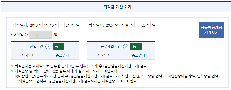 고용노동부에서는 퇴직금 계산기를 제공하여 복잡한 퇴직금 계산을 쉽게 할 수 있습니다. 해당 계산기를 사용하면 입사일자, 퇴직일자, 재직일수 등을 입력하여 예상 퇴직금을 간편하게 계산할 수 있습니다.