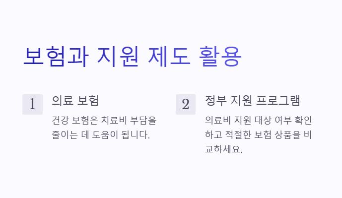 다행히도, 건강 보험과 정부 지원 프로그램은 치료비 부담을 줄이는 데 도움이 될 수 있습니다. 의료비 지원 대상에 해당하는지 확인하고, 적절한 보험 상품을 비교하여 경제적인 해결책을 찾는 것이 중요합니다.