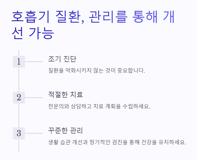 호흡기 질환은 치료와 관리를 통해 충분히 개선될 수 있는 질환입니다. 하지만 무엇보다 중요한 것은 조기 진단과 예방적 관리를 통해 질환을 악화시키지 않는 것입니다. 호흡기 건강에 대한 꾸준한 관심과 적절한 정보를 바탕으로 더 나은 삶의 질을 누리세요.