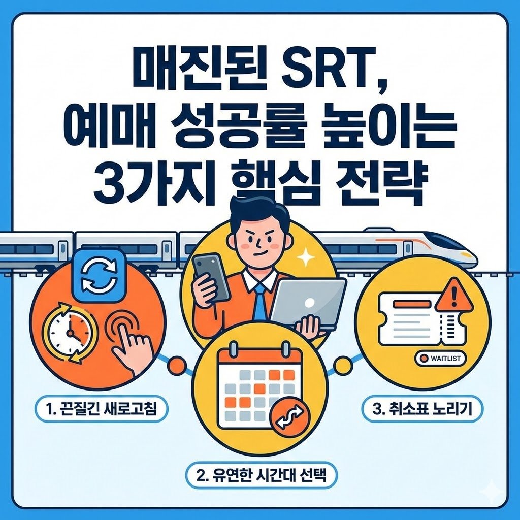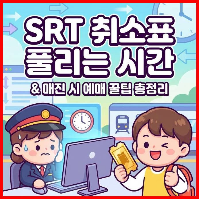 명절, 주말, 성수기 SRT 예매, 매진 때문에 좌절하셨나요? SRT 취소표가 풀리는 황금 시간대를 파악하고, 매진 상황에서도 성공 확률을 높이는 3가지 핵심 전략을 알면 원하는 시간대 SRT 좌석을 잡을 수 있습니다. 지금 바로 SRT 취소표 예매 성공률을 극대화하는 비법을 확인하세요!