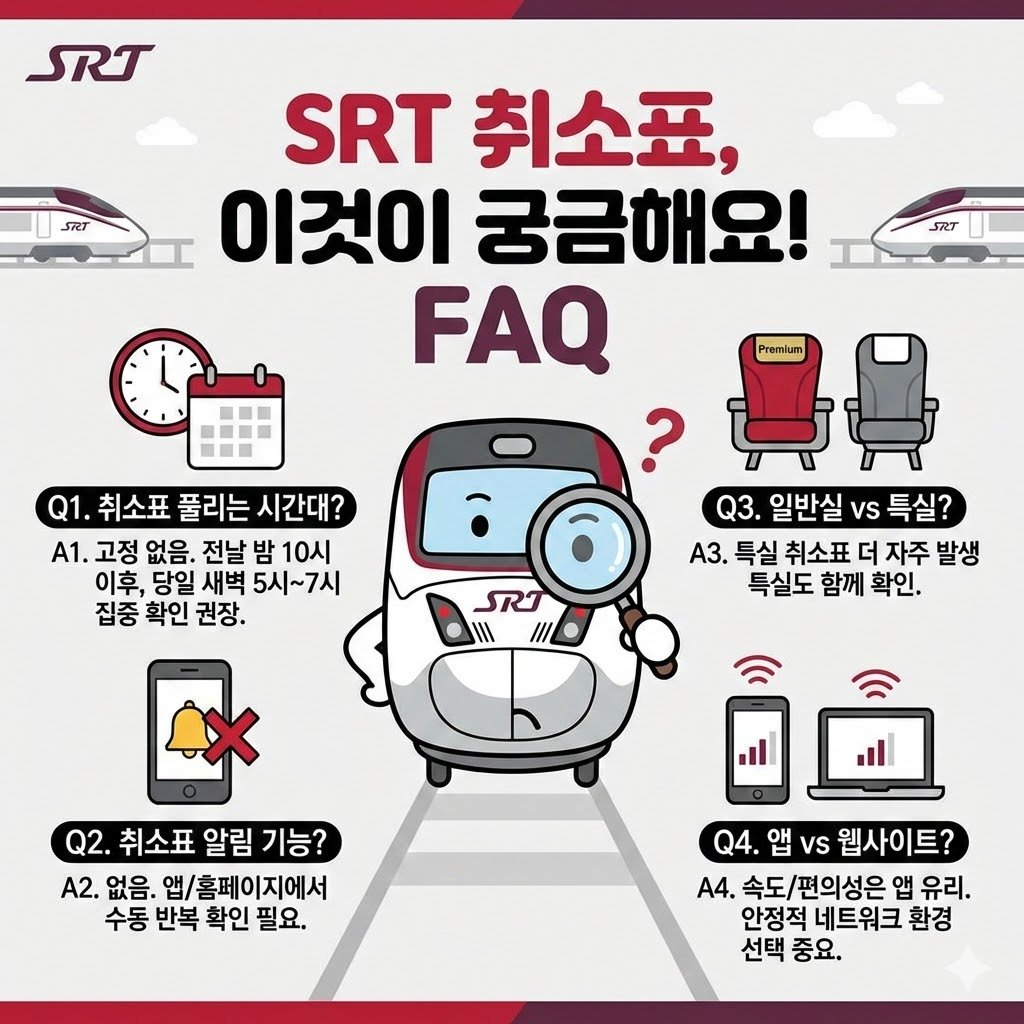 A2. 현재 SRT에는 취소표 자동 알림 기능이 제공되지 않습니다. 따라서 직접 앱이나 홈페이지에서 수동으로 반복 확인하셔야 합니다.